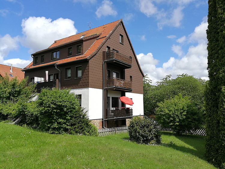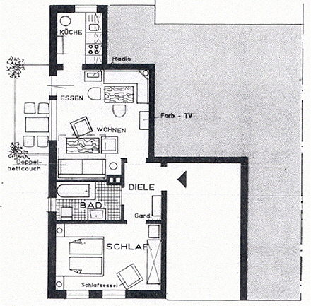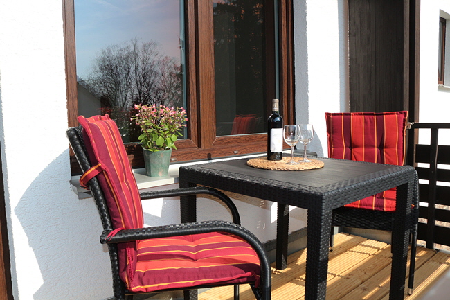 Auf dem großen sonnigen Balkon befinden sich im Sommerhalbjahr bequeme Balkonmöbel.