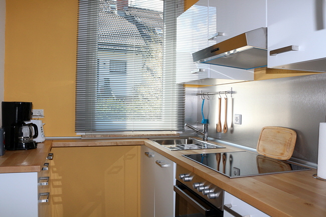 Die modern eingerichtete offene Küche ist ausgestattet mit Geschirrspüler, Cerankochfeld, Backofen, Kühlschrank mit Eisfach, Kaffeemaschine, Toaster, Wasserkocher sowie ausreichend Geschirr für 4