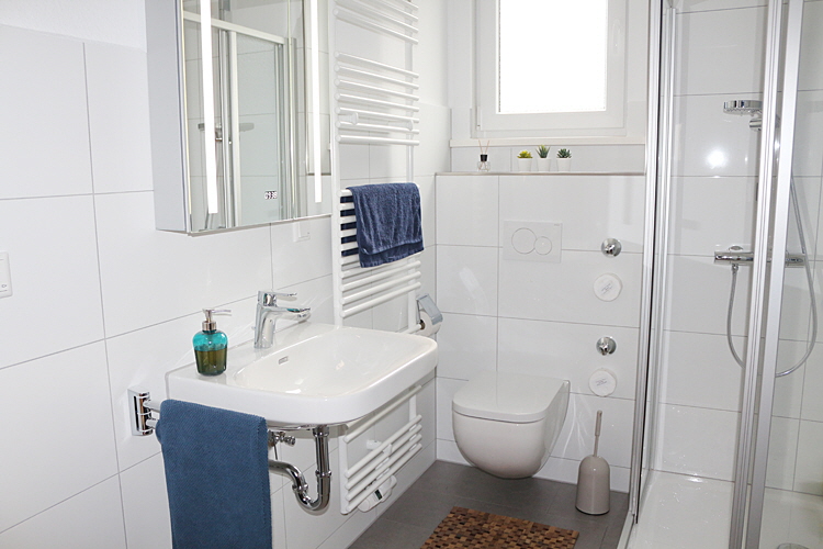 ausgestattet mit Dusche, Waschbecken und Wand-WC, ein Föhn liegt für Sie bereit.