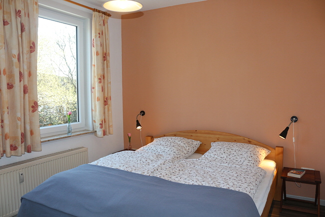 Desweiteren verfügt unser Ferienwohnung über ein relativ großes freundliches Schlafzimmer mit großem Doppelbett (180 x 200 cm) und großem Schrank für’s Gepäck.