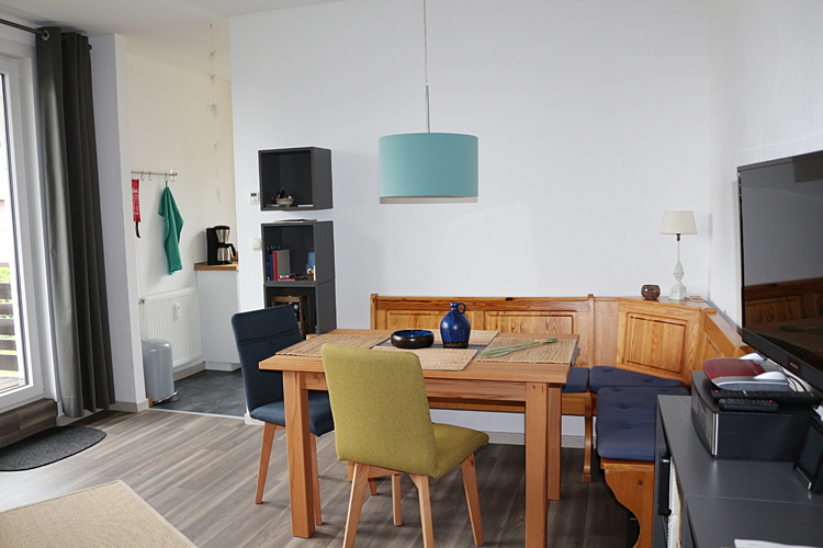 verfügt über zwei bequeme Sessel, Doppelbettcouch (140 x 200 cm) sowie eine gemütliche Essecke mit schönem Blick nach draußen. WLAN, Flat-TV und Mini-Stereoanlage mit CD, USB und Bluetouth gehören zur